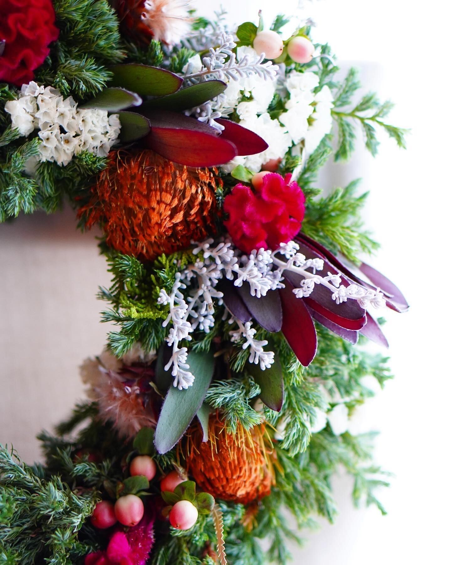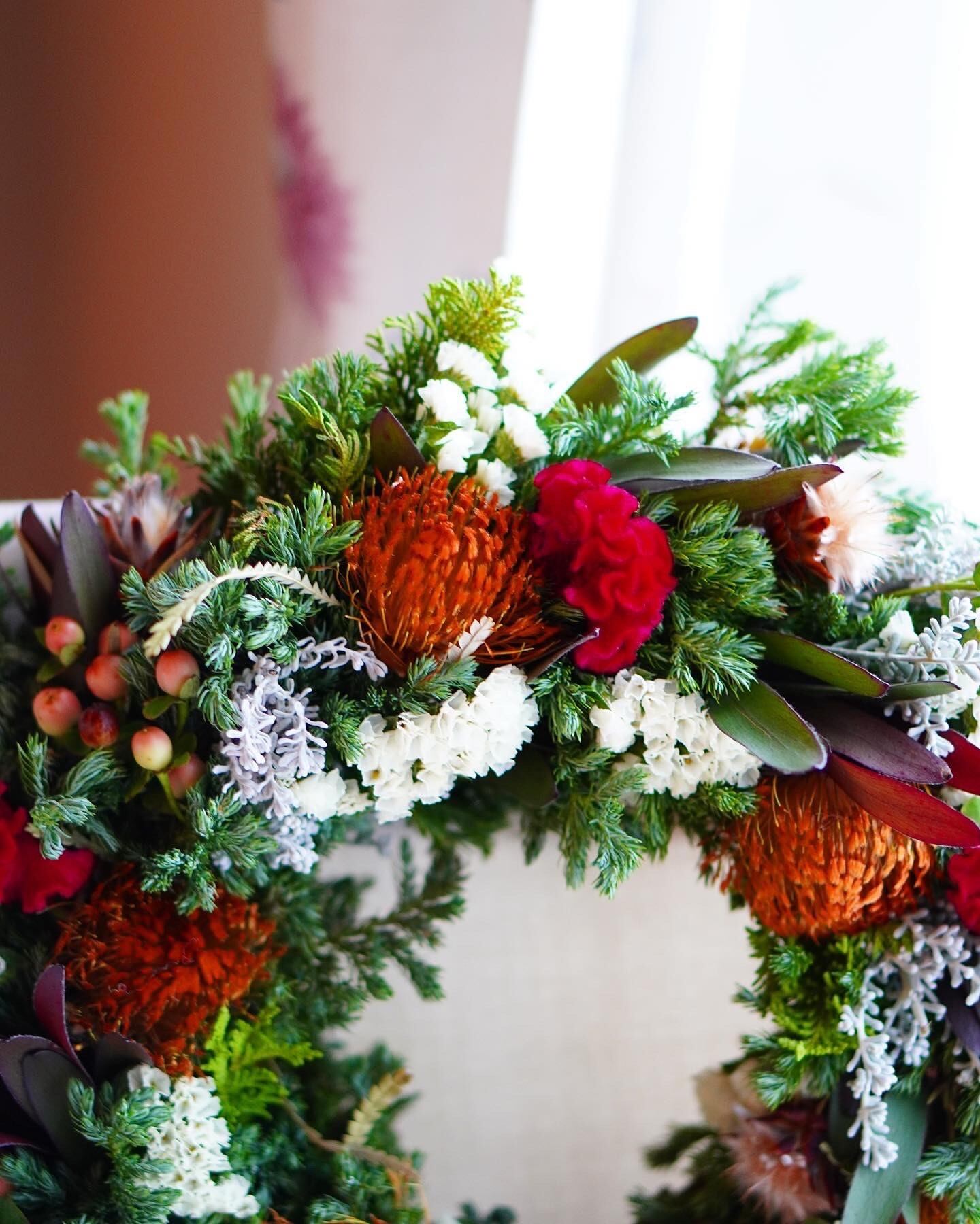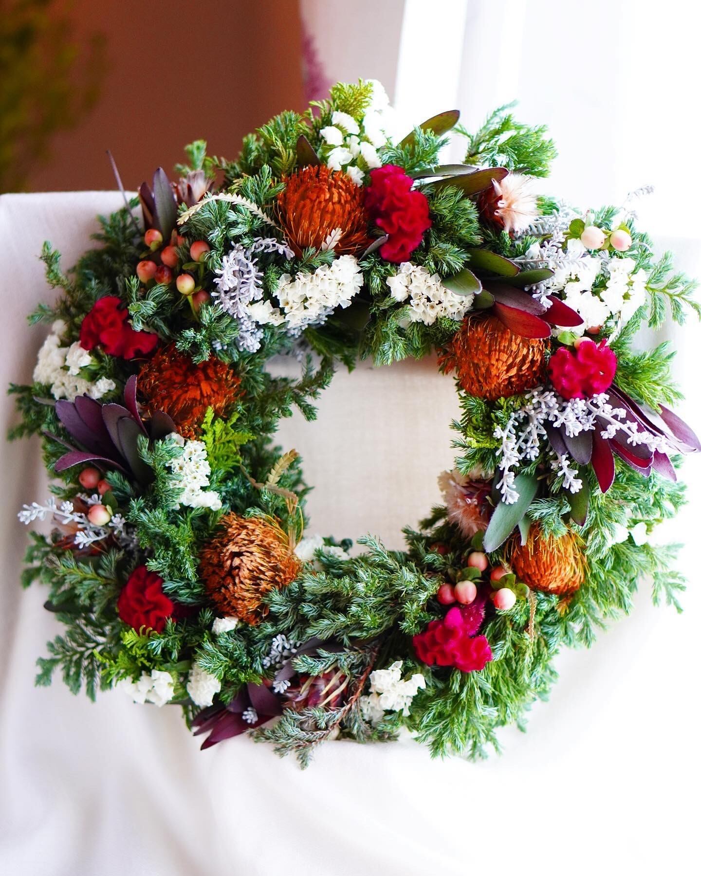 モミ、ヒムロスギ、ケイトウなどで作るフレッシュクリスマスリース。リース土台は直径20cm、実物は直径約28cm。生花ですがリースとして飾っているとドライになります。